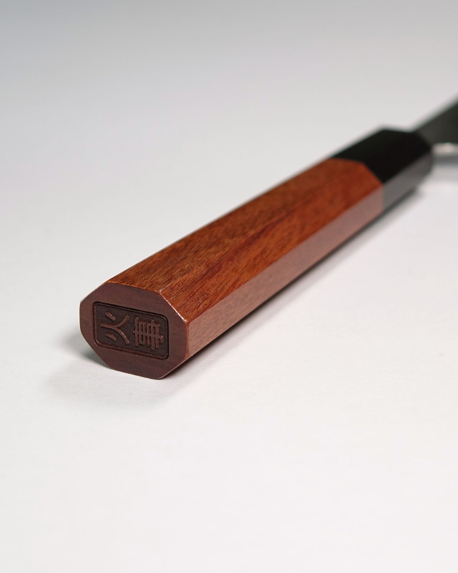The hexagonal handle is crafted to provide a comfortable and natural grip. The bubinga wood handle subtly adds Japanese design, offering durability and elegance to any kitchen.