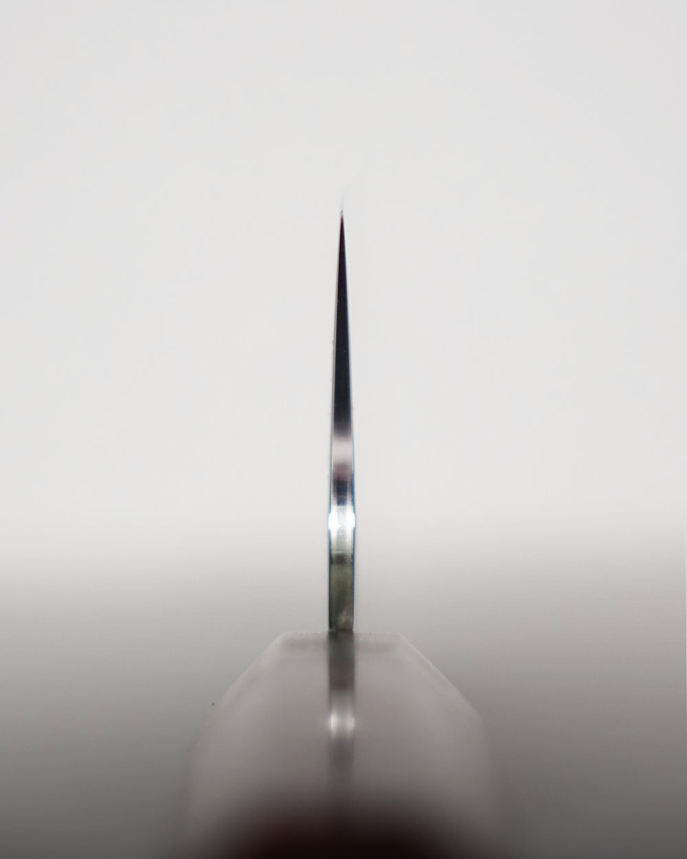 The V-shaped grind on the Gyuto's blade is honed in with a thin bevel and seamlessly reaches the edge to a microscopic point.