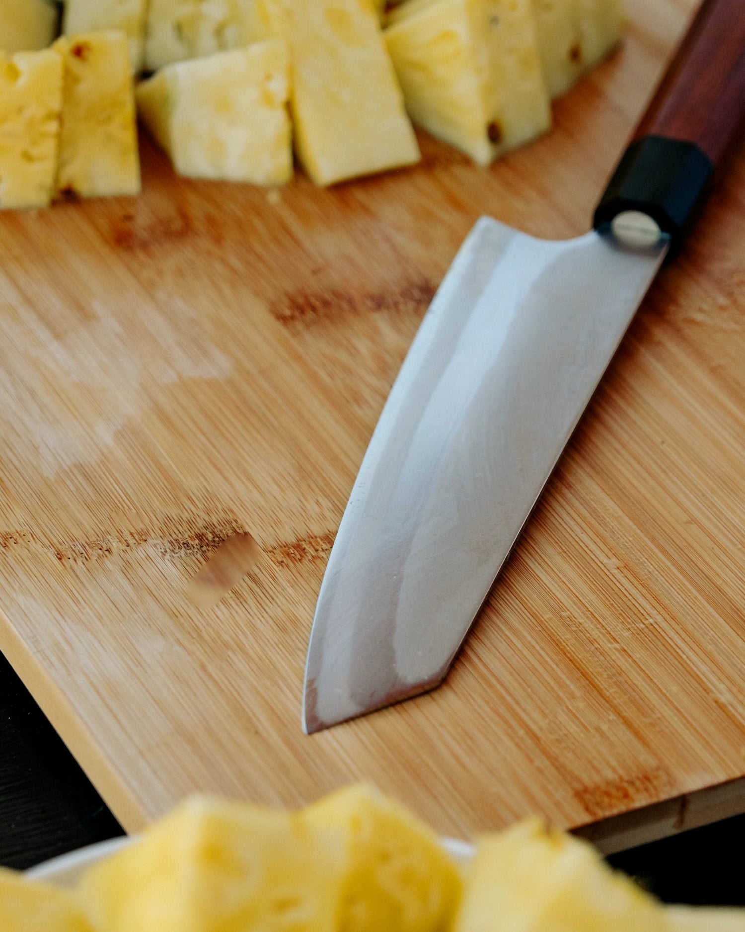 The curved belly of our gyuto, following the cutting edge, is crafted to make techniques like the 'rock chop' easier, ensuring accuracy in each cut.